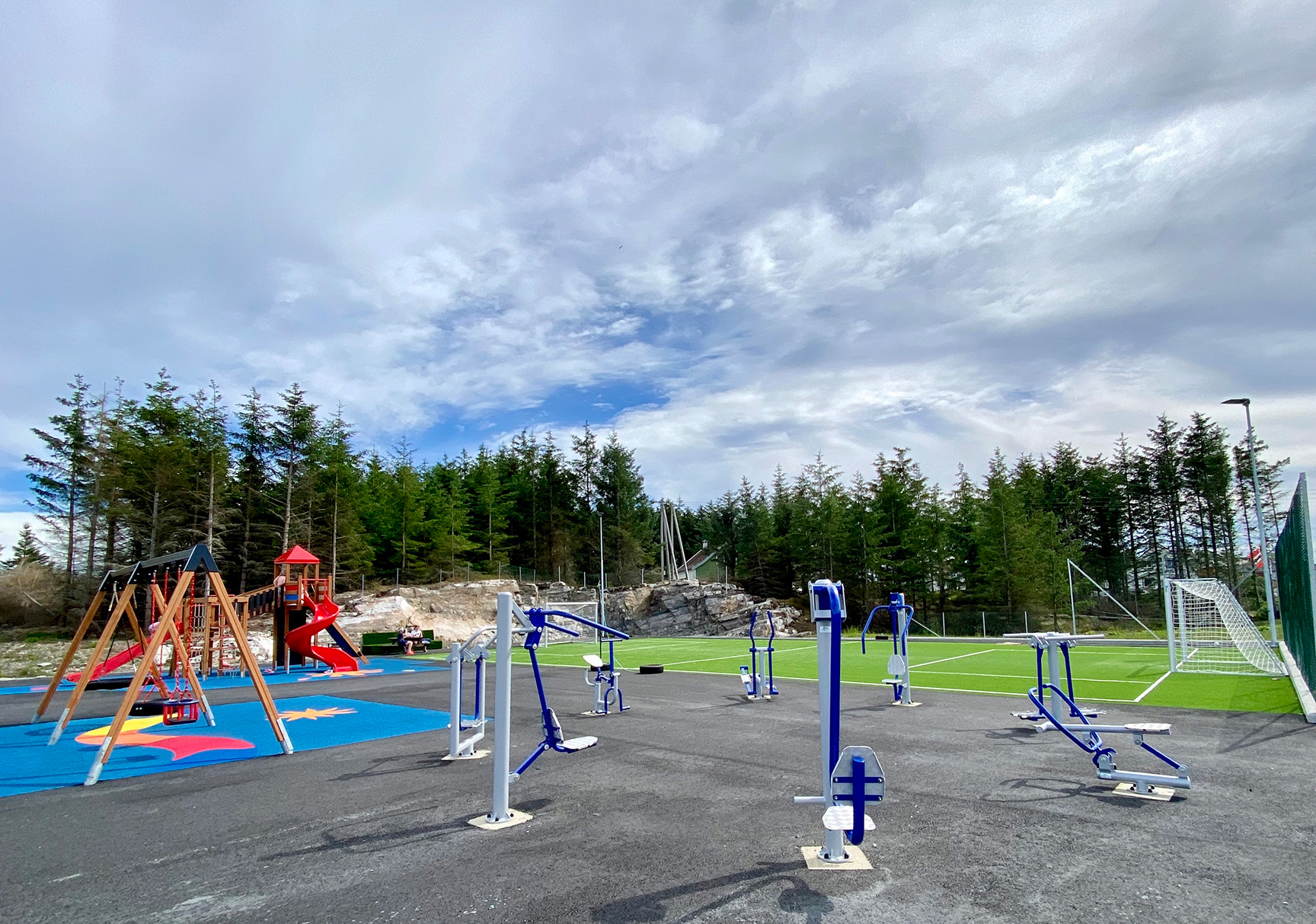 Helt nord i Øygarden kommune finner du vakre Hellesøy. Her har vi levert et nærmiljøanlegg bestående av fotballbane, treningspark, lek og sport. Det fargerike lekeslottet og huskesetene gir høy lekeverdi til barna, mens treningsparken gir unge og voksne mulighet til å være aktiv og trene kroppens ulike muskelgrupper. Her kan både voksne og barn boltre seg i naturskjønne omgivelser!