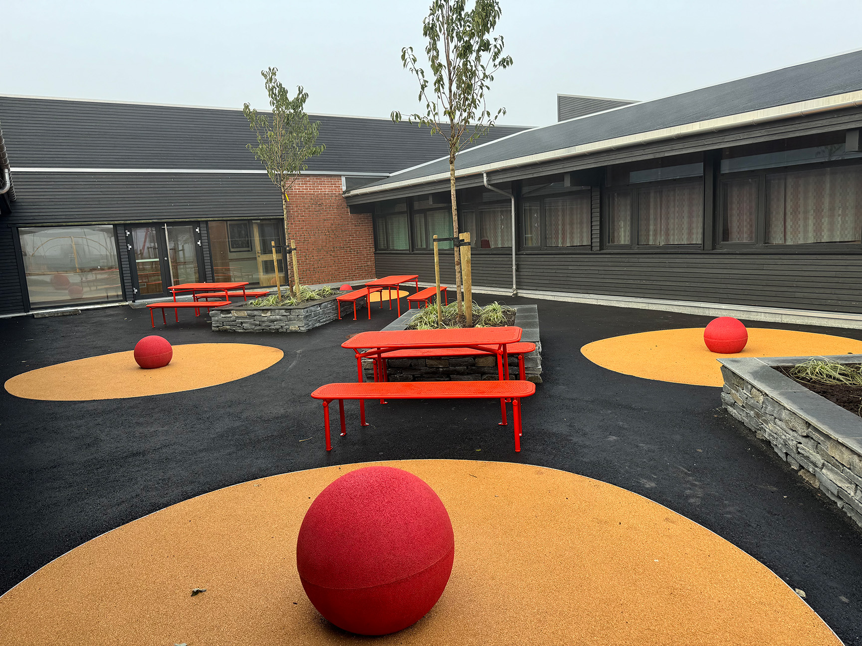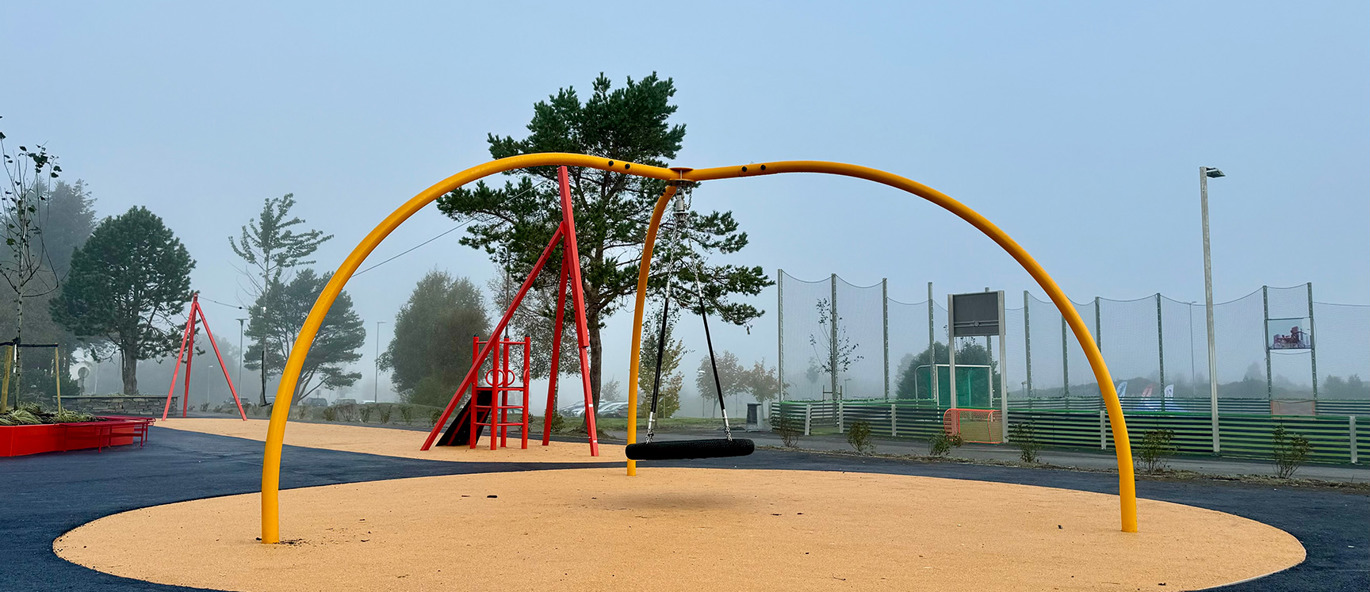 Vi også montert en spennende taubane – en aktivitet som alltid skaper stor begeistring hos barna. Alle produktene er levert i valgte RAL-farger, som bidrar til å skape et flott uttrykk på skolens uteområde.