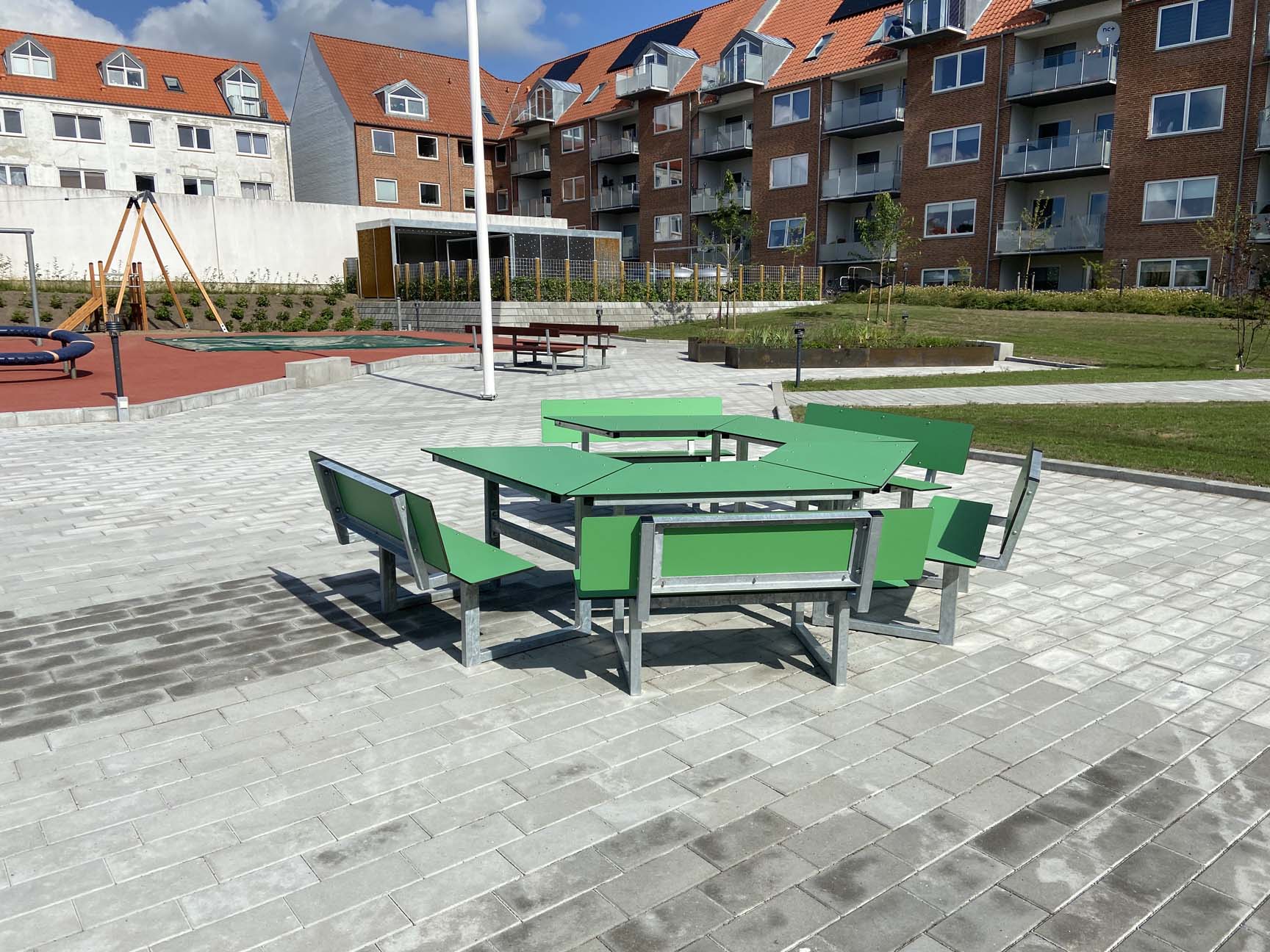 I tillegg til aktivitetene er det også tenkt på oppholdsmuligheter. Dette gjør aktivitetsplassen til en naturlig møteplass for beboerne i borettslaget.