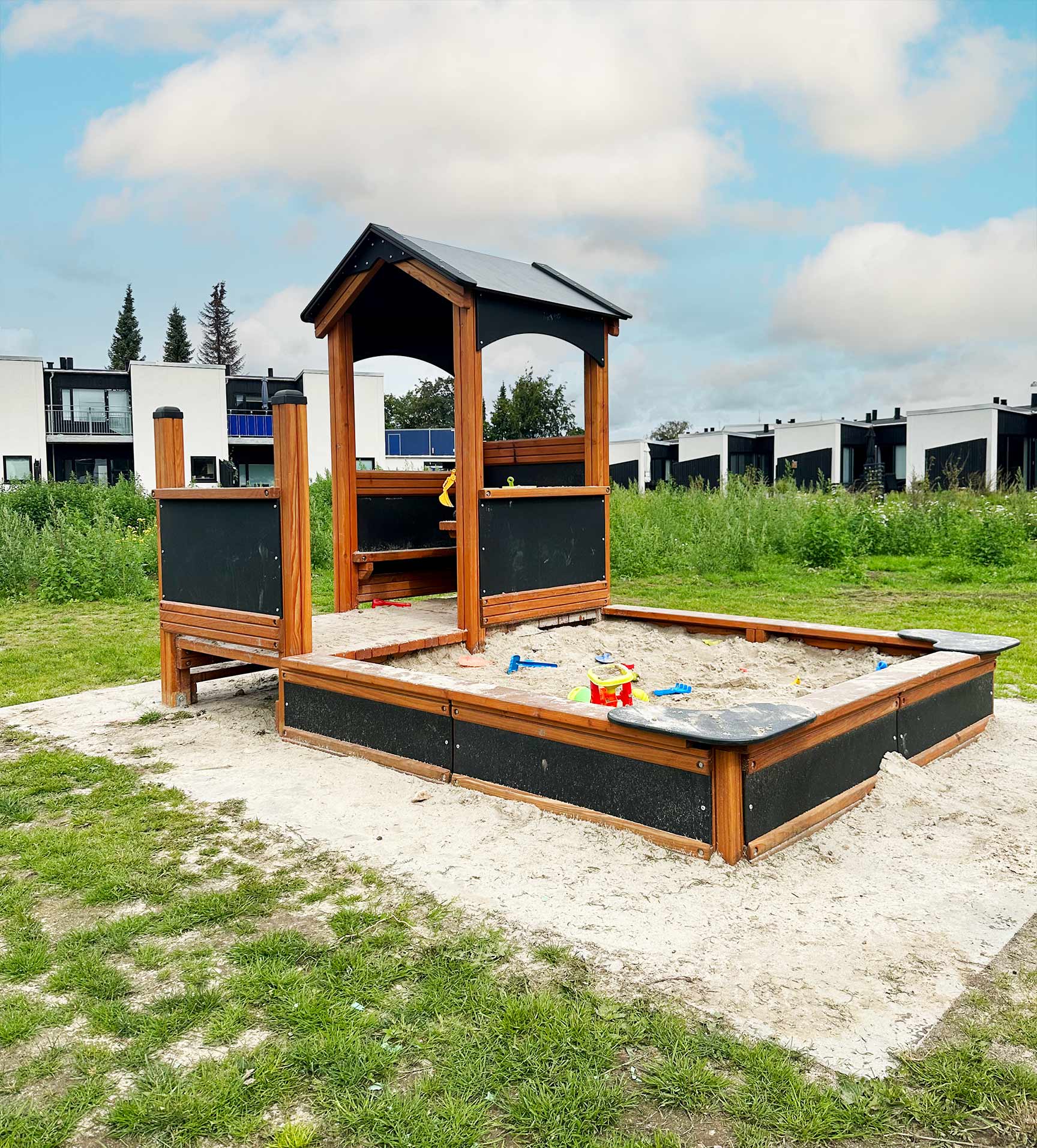 Det er også lagen en øy med overbygd oppholdssted, hvor foreldrene kan slappe av mens barna leker. Samtidig er det god utsikt over hele lekeplassen.