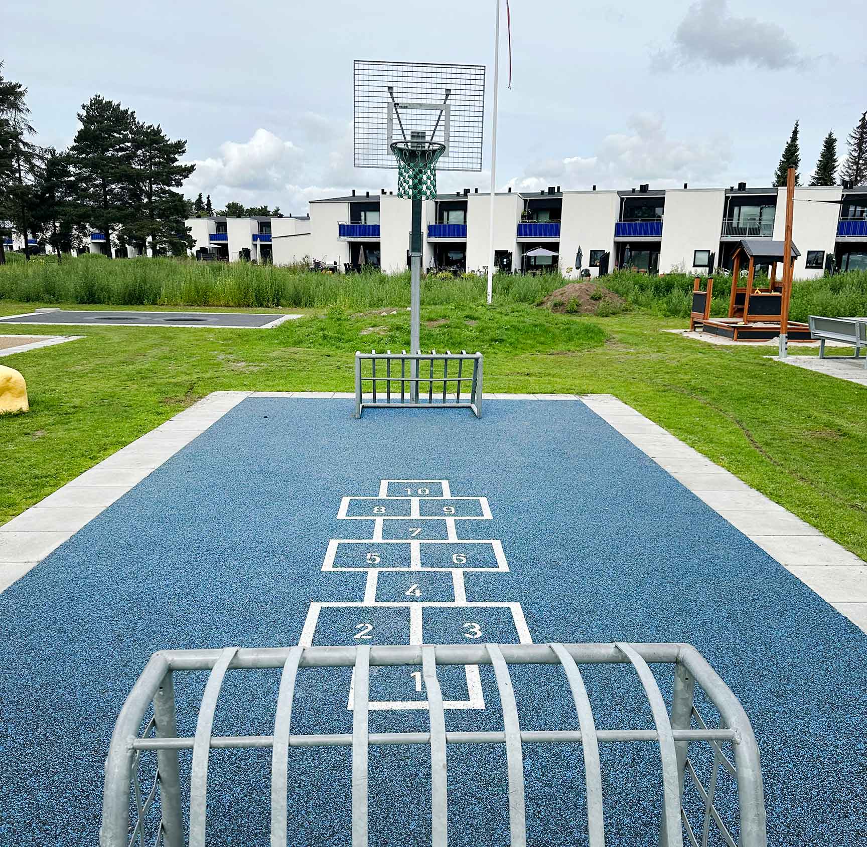 Lekeplassen er utformet i samarbeid med arkitekten som hadde ansvaret for resten av utearealene i nybygget. Det gir en fantastisk helhetsfølelse av området.