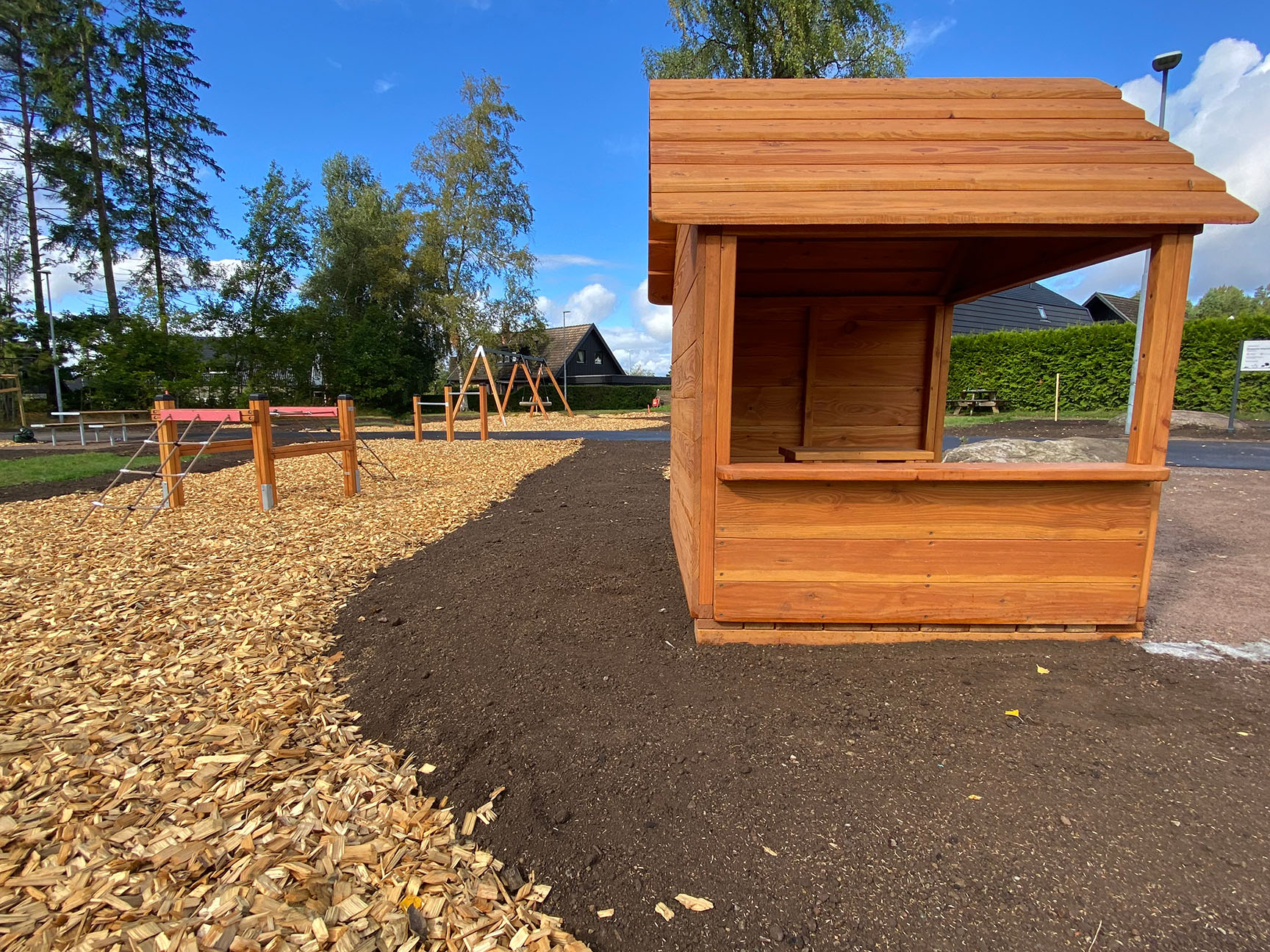 Renoveringen av lekeplassen var etterlengtet. Med svingete stier, varierte overflater og lekeapparater laget av vakkert lerketre er naturen virkelig til stede. Ved også å legge til rette for steder til kaffepauser, er området garantert velbesøkt og et samlingssted for hele familien.