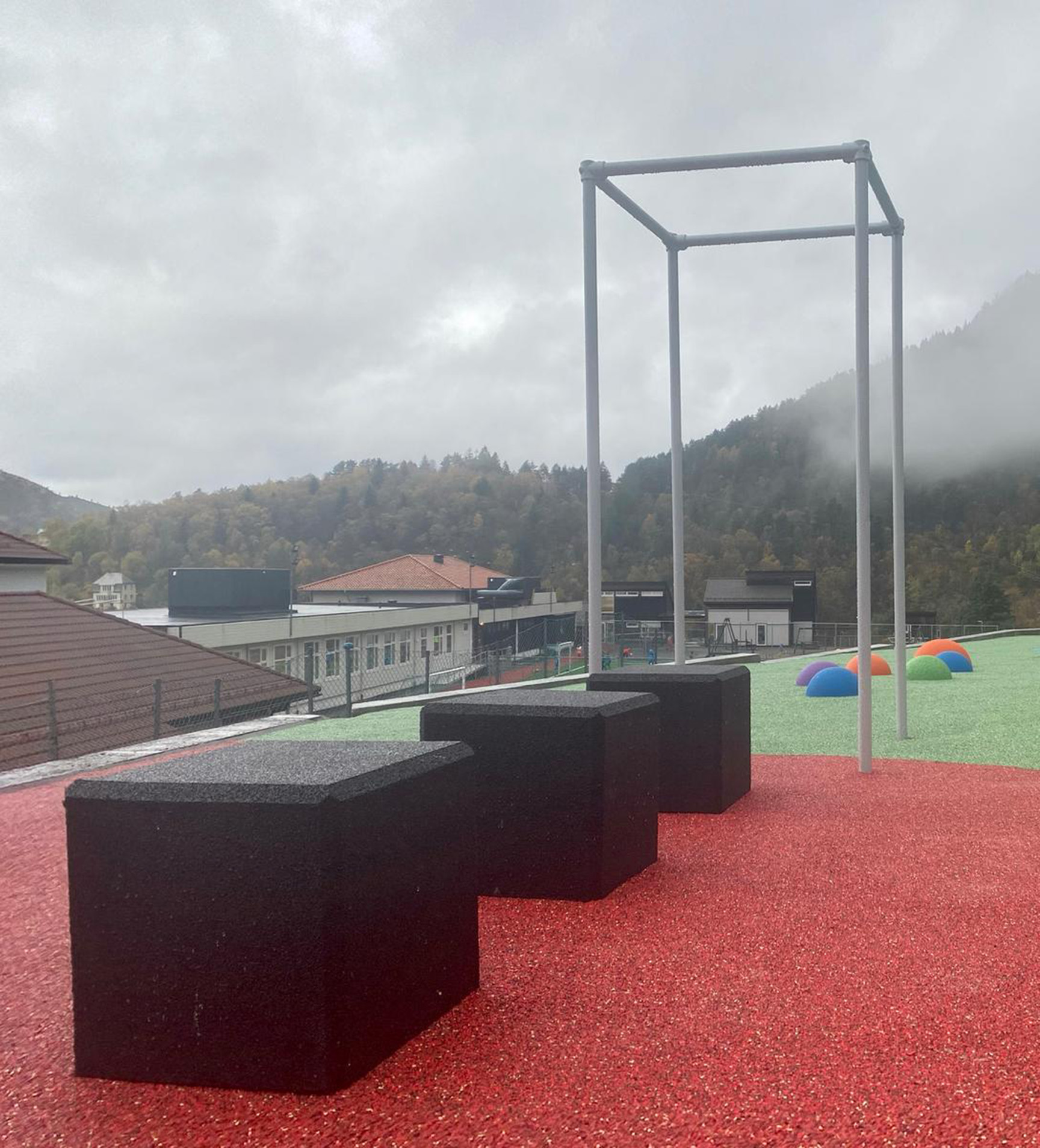 Her ble det bevisst valgt spreke og fine farger på apparater og fallunderlag. Med mye fjell og grønt vil skoleplassen være et perfekt pusterom for både elever og ansatte.