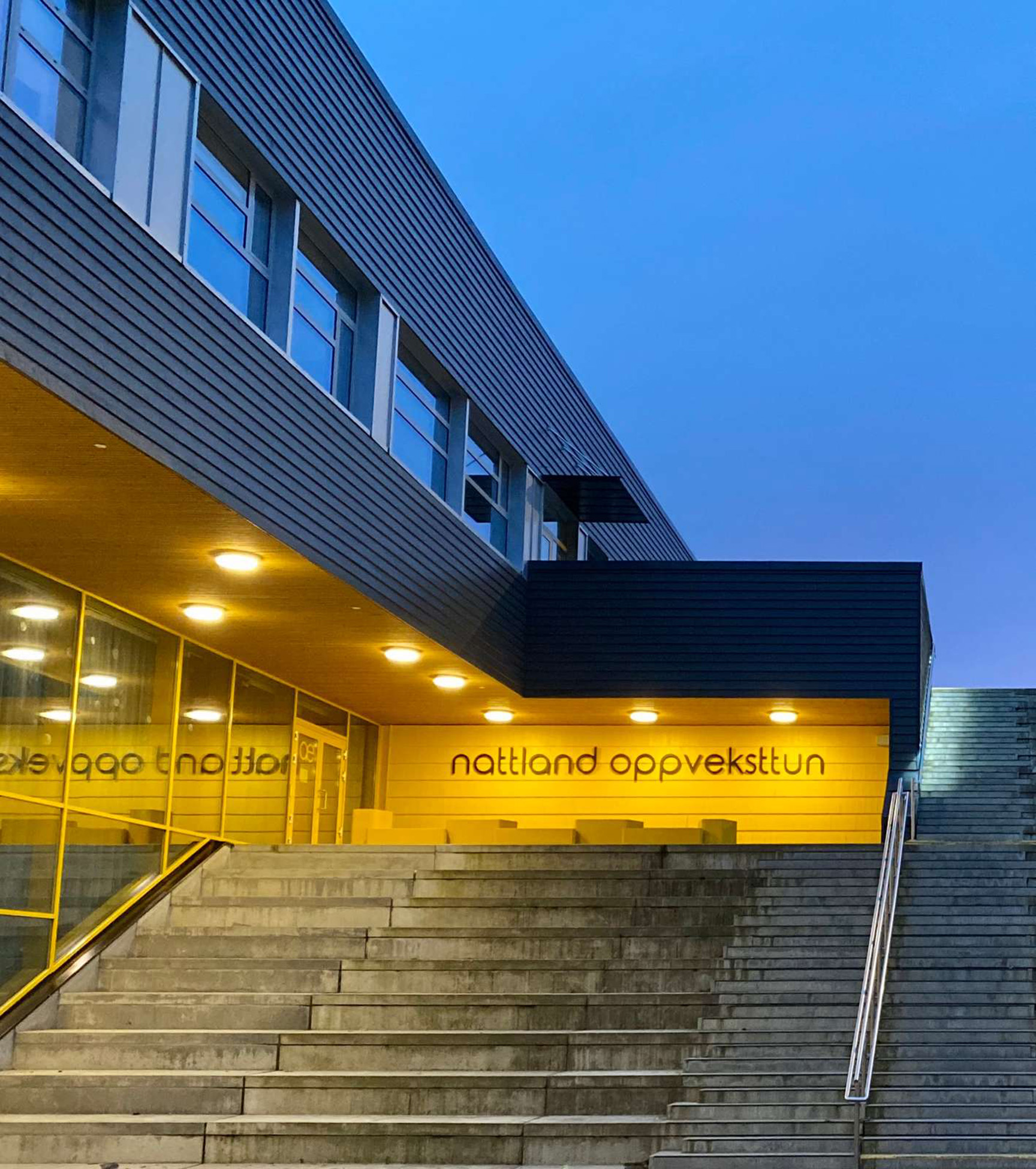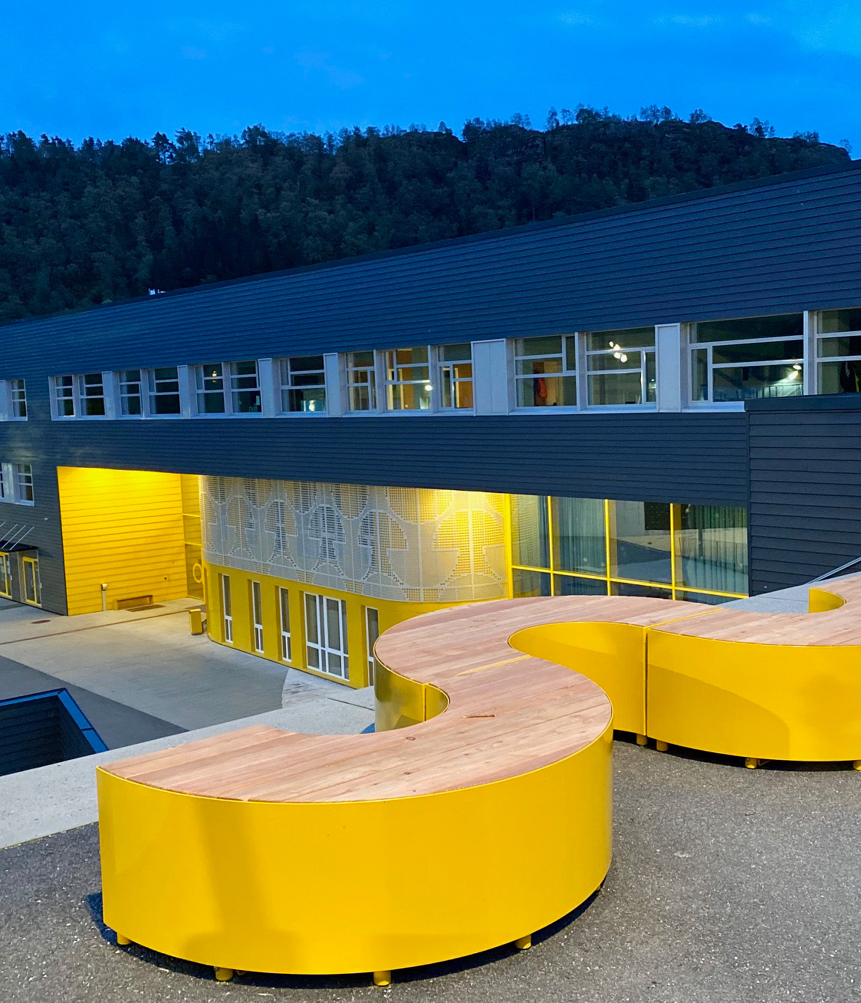Ved Nattland oppveksttun har vi levert moderne sittegrupper og benker fra vår Mobilis Design-serie. Skolens RAL-farge, som du finner flere steder på bygget, går igjen som en rød tråd i sittemodulene ved inngangen. Den i øyefallende gulfargen, de organiske formene og de fine lerke-detaljene resulterte i et stilrent blikkfang ved hovedentreen til Nattland oppveksttun.