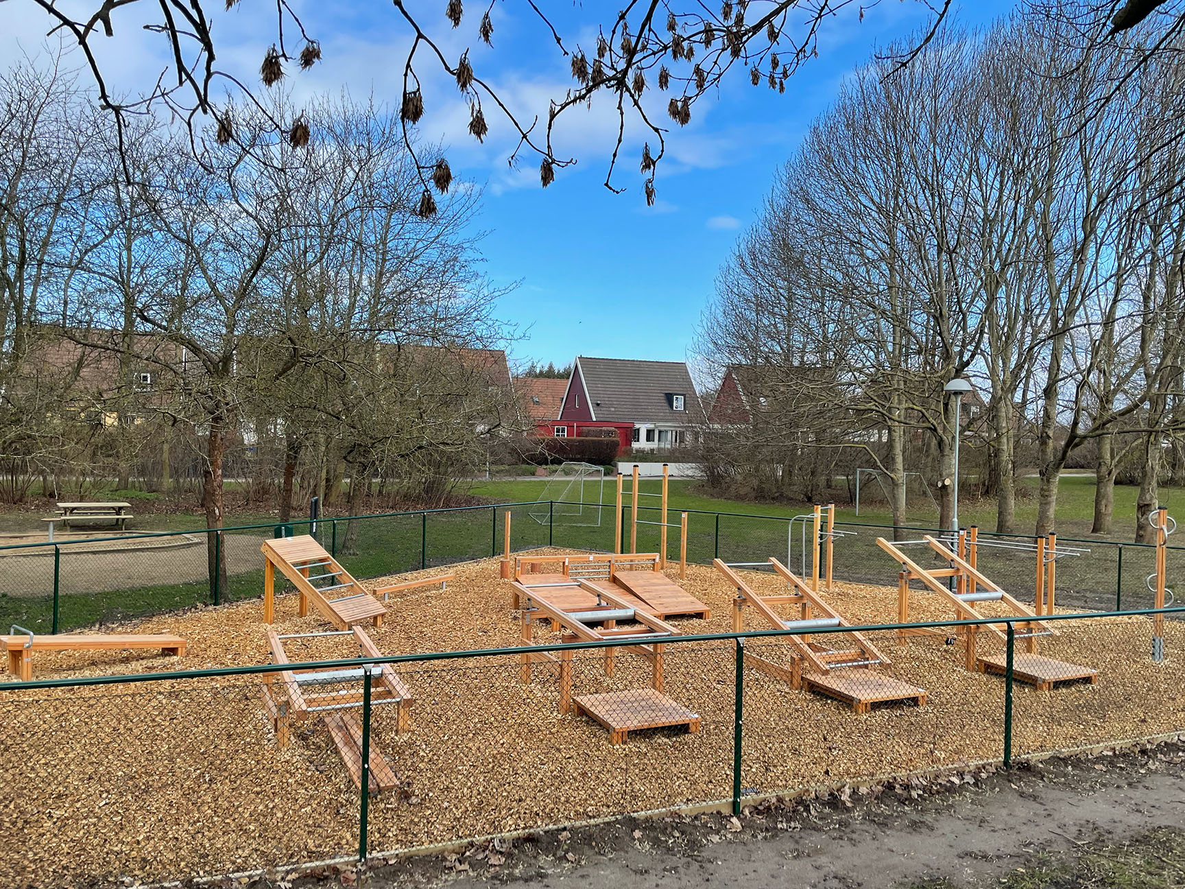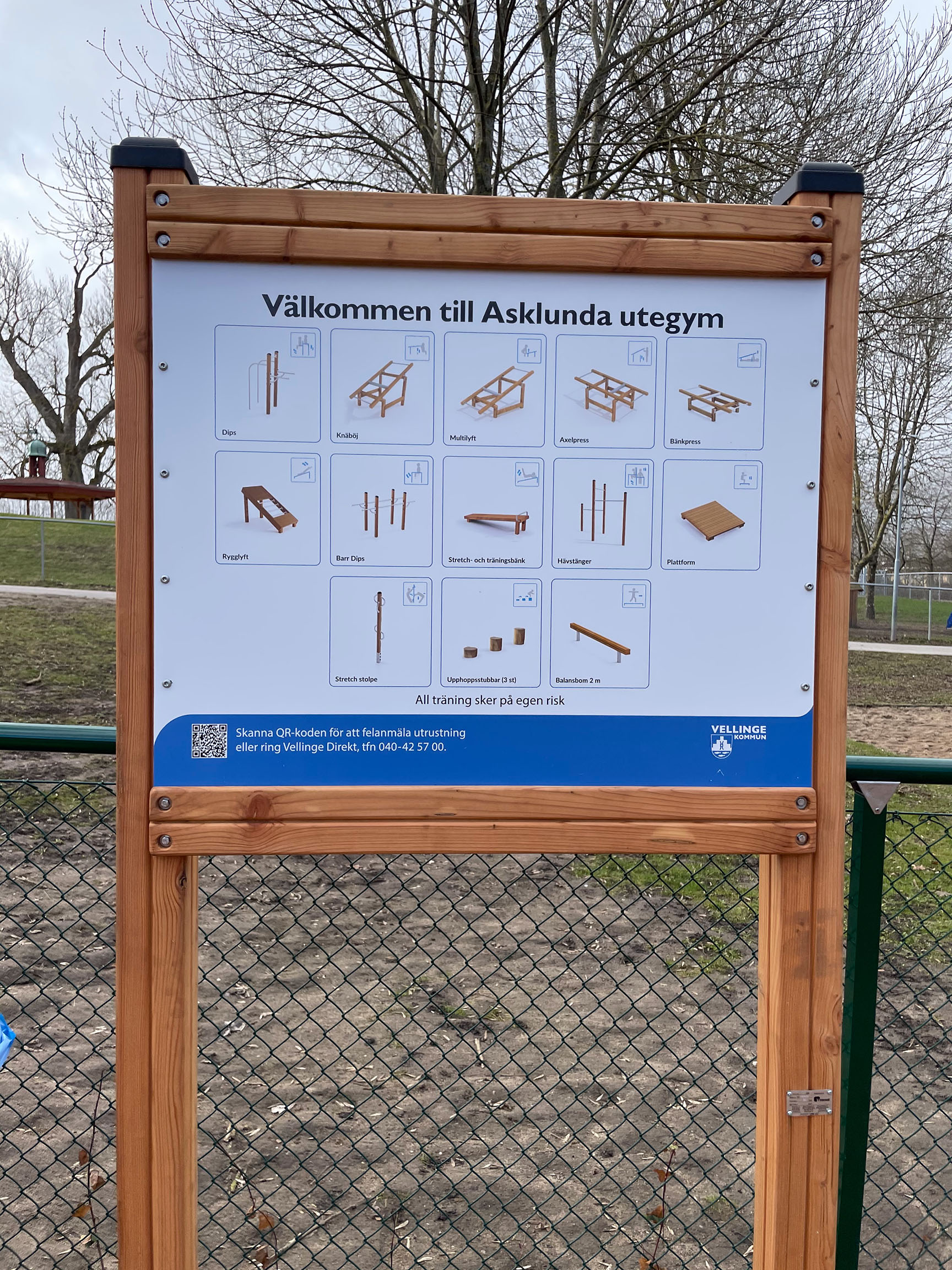 Tress utegym i lerk er minimalistiske og tar mindre plass enn mange andre utendørs treningsstasjoner. I Vellinge var det et begrenset areal tilgjengelig, men det ble likevel plass til 13 ulike treningsstasjoner som utgjør et komplett utegym.